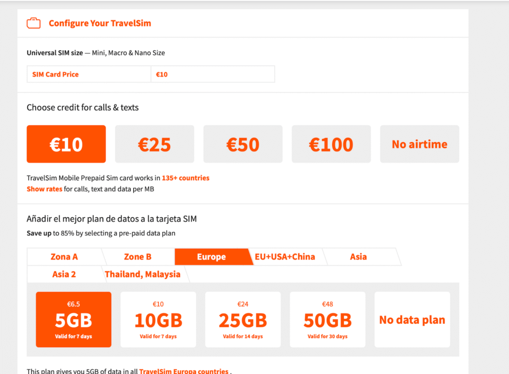 Como los planes varían mucho según destino, lo más fiable es comprobar siempre el precio final directamente en la web oficial de TravelSIM, donde puedes ver los GB, la validez y el coste total antes de comprar.