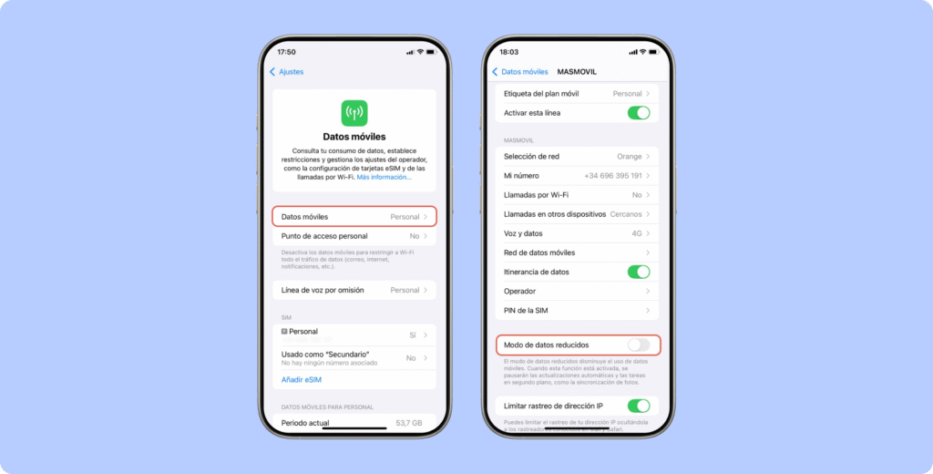 Limita datos en segundo plano, desactiva actualizaciones automáticas y activa el Modo de datos reducidos para evitar consumos invisibles.