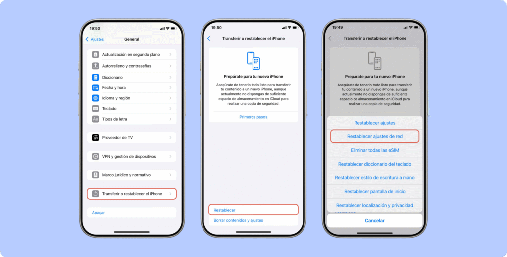 Si ves barras de cobertura pero no navega, activa y desactivar el modo avión para forzar la reconexión.