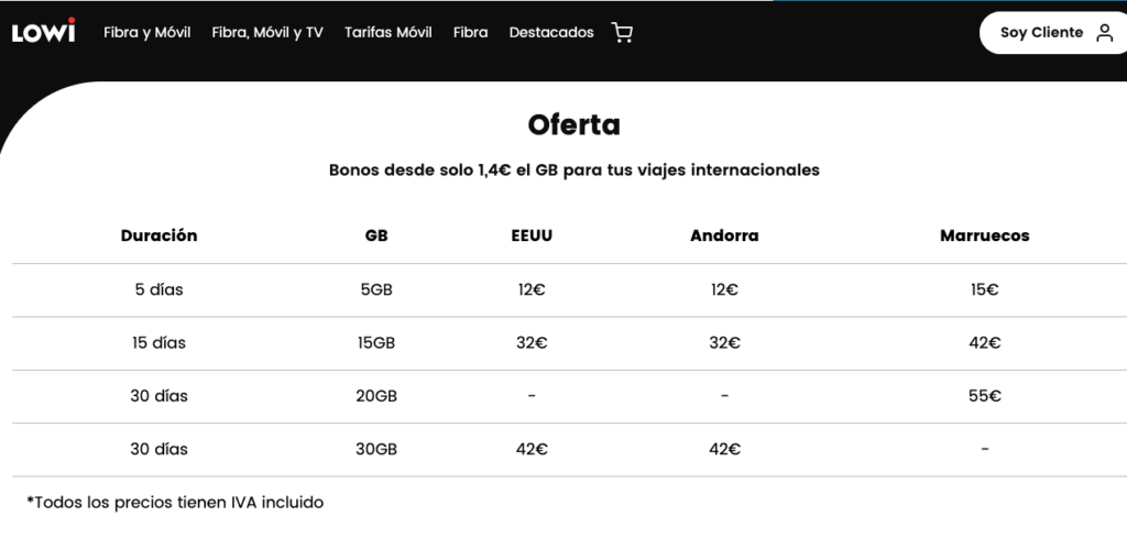 También Lowi ofrece bonos para viajar a países como Estados Unidos, Marruecos y Andorra, como puedes ver en la siguiente imagen: