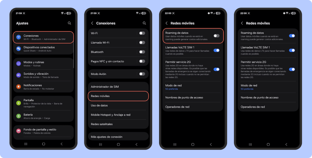 En caso de que esto no suceda puedes configurar la itinerancia de datos de tu móvil de forma manual siguiendo estos pasos: