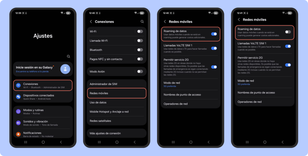 Te conviene desactivar el roaming si vas a usar una eSIM, una SIM local o te vas a mover casi siempre con WiFi. Yo lo hago para evitar que mi móvil consuma datos por defecto y se me cobren cargos extras.