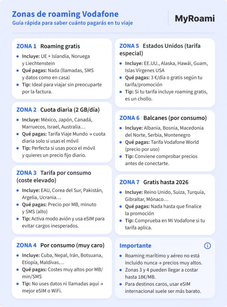 Vodafone divide el mundo en varias zonas de roaming. Según la zona, el roaming puede ser gratuito, tener una tarifa diaria o cobrarse por consumo.