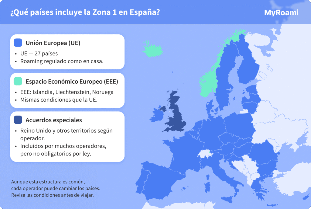 La Zona 1 se define legalmente en torno al Espacio Económico Europeo (EEE). En España, los principales operadores —Movistar, Vodafone, Orange y Yoigo— siguen la misma base: