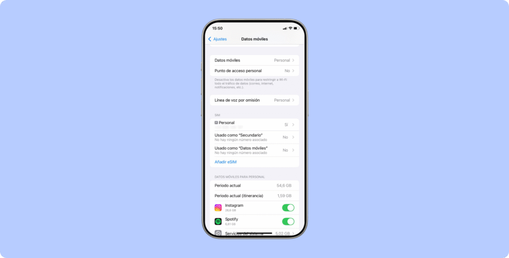 Entra en Ajustes → Datos móviles y revisa qué SIM o eSIM está seleccionada como línea de datos. Asegúrate de que el roaming esté desactivado en la otra línea.