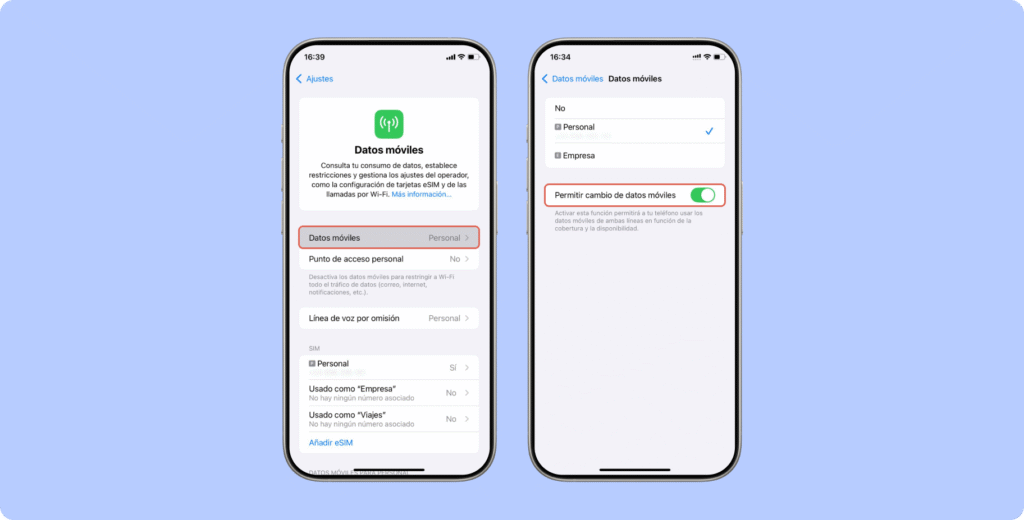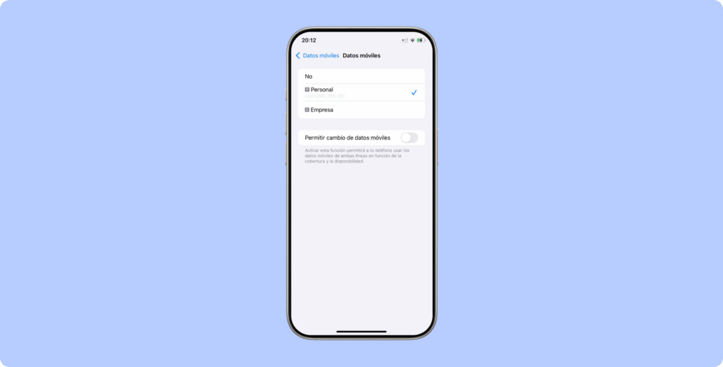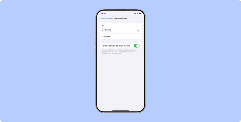 Permite que el iPhone use automáticamente los datos de la otra línea si la principal no tiene buena cobertura o se queda sin señal.