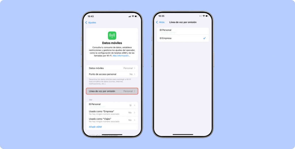 Para esto, mantengo mi SIM principal activa y la configuro como línea de voz por omisión. Así sigo recibiendo SMS, códigos de verificación y llamadas importantes, aunque los datos vengan de la eSIM.