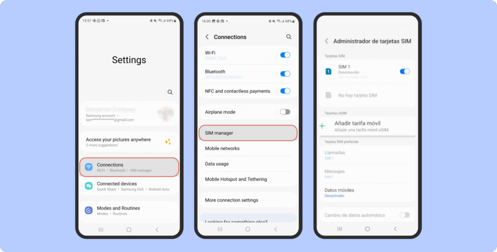 Una vez que ya tengas agregada tu eSIM o SIM extra en el móvil, entra a Ajustes > Conexiones > Administrador de tarjetas SIM (que es el gestor de tarjetas SIM).