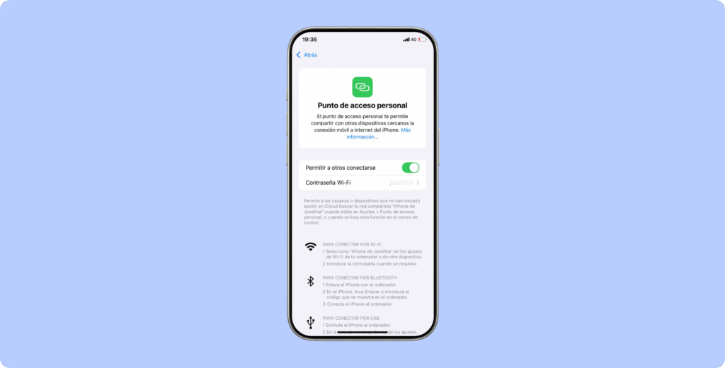 Revisa el apartado Punto de acceso personal y comprueba que está activo para compartir a otros dispositivos.