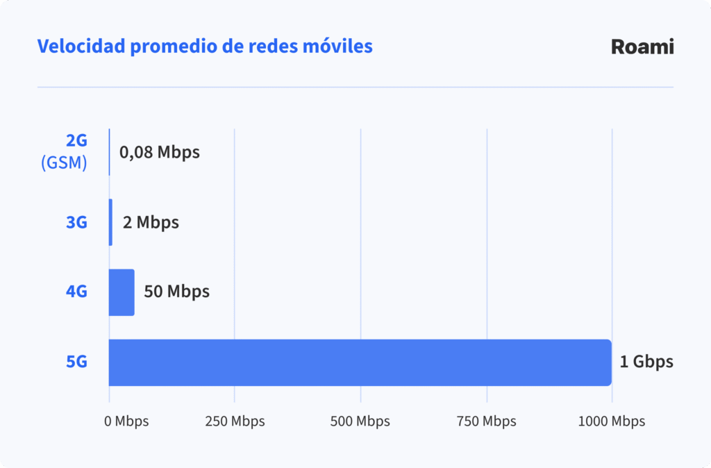 | 2G (GSM) | Hasta 0,1 Mbps | Llamadas y SMS | Voz digital + SMS | Bajo | Alta (móviles básicos) |
