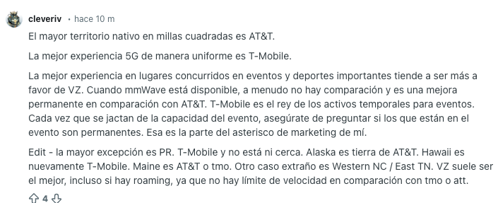 Esta experiencia coincide con lo que comentan otros usuarios en Reddit, donde varios viajeros señalan que AT&T ofrece mejor cobertura general al viajar por carretera y en zonas menos pobladas, especialmente en el centro y este del paÃs.
