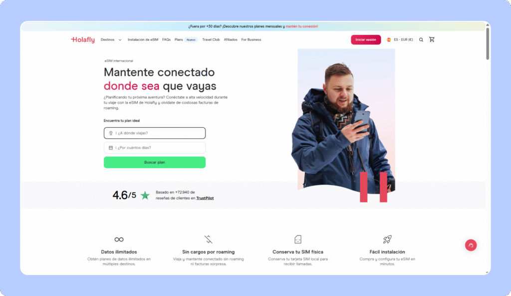Holafly ofrece una eSIM internacional. Sus planes están orientados a viajeros que buscan conexión continua sin cambiar de tarjeta entre países.