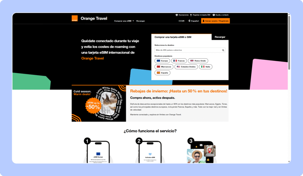 Orange Holiday es una solución de SIM física y eSIM pensada específicamente para viajes por Europa, respaldada por uno de los operadores más consolidados del continente. Asimismo, Orange Travel es una opción eSIM con cobertura mundial que funciona por medio de las redes de Orange.