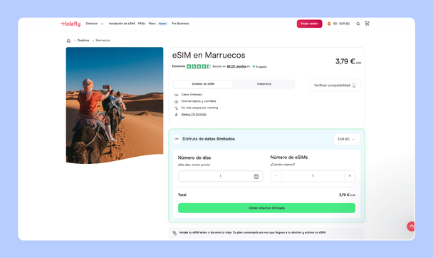 Holafly es la opción más cómoda (y mi favorita) si no quieres complicarte al llegar a Marruecos. Funciona con eSIM internacional, lo que significa que no necesitas tarjeta física: compras online, escaneas un QR o descargas la eSIM y ya tienes internet nada más aterrizar.