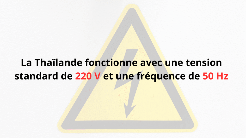 Bonne nouvelle pour les voyageurs français : la Thaïlande utilise une tension standard de 220 V et une fréquence de 50 Hz, des valeurs identiques à celles de la France. Vous n'aurez donc pas besoin de convertisseur de tension.