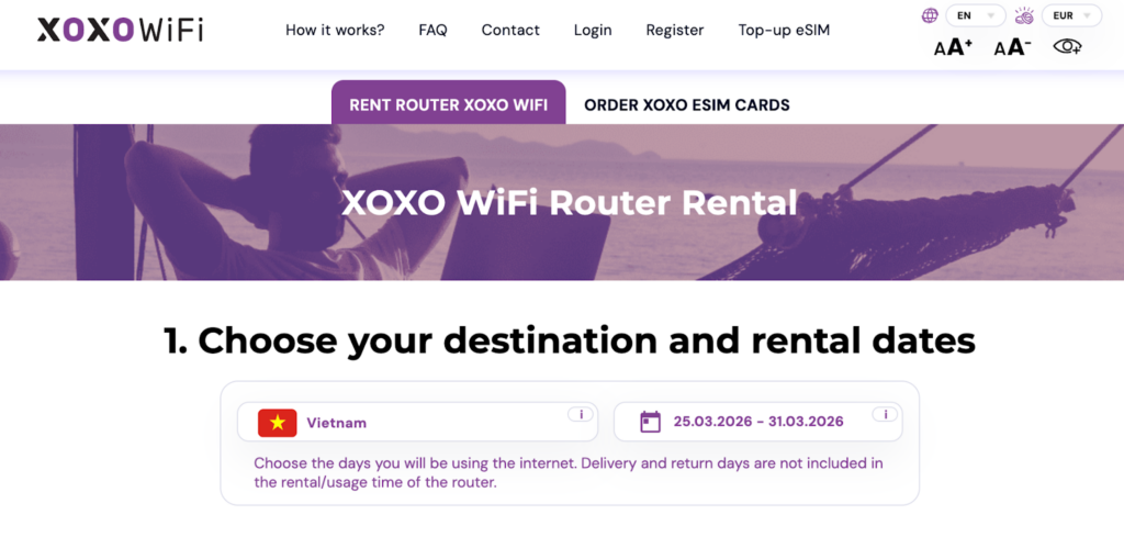 XOXO WiFi is a Polish-based provider with a straightforward rental model: you pick your destination, choose a daily data package, and the router gets delivered to you. Vietnam is one of their covered destinations, and the tiered pricing gives you more control over what you actually pay for rather than defaulting to unlimited.