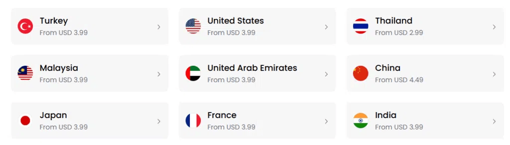 Con sede a Singapore, Airalo è un fornitore di eSIM leader che offre una copertura globale senza pari con opzioni eSIM locali, regionali e globali. Copre oltre 200 paesi, anche con alcuni piani multi-destinazione. Inoltre, la loro app dedicata semplifica l'acquisto, la gestione e il ricarica del tuo eSIM in viaggio. È ideale per i viaggiatori che visitano più destinazioni o regioni remote.