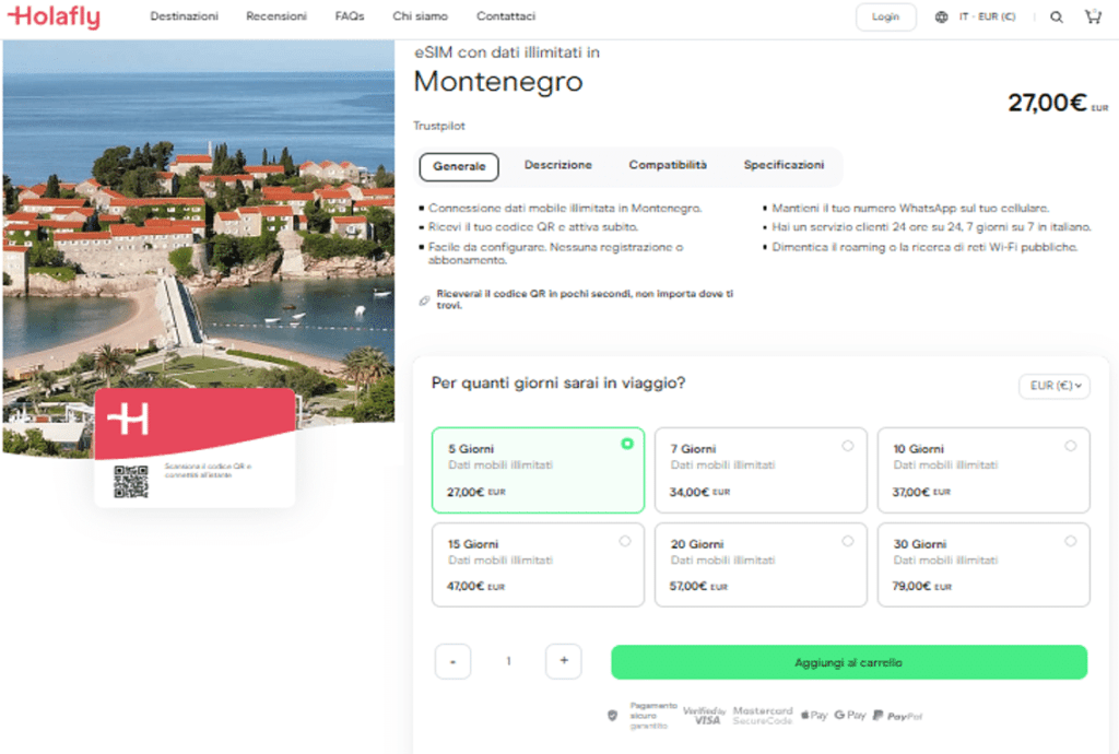 La cosa migliore è acquistare una SIM virtuale per il Montenegro prima del viaggio dal negozio online di Holafly. Goditi dati illimitati e opzioni a seconda della durata del tuo viaggio.