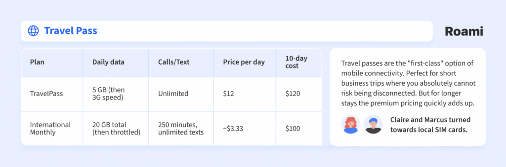The Verdict: Travel passes are the "first-class" option of mobile connectivity. Perfect for short business trips where you absolutely cannot risk being disconnected. But for longer stays the premium pricing quickly adds up.