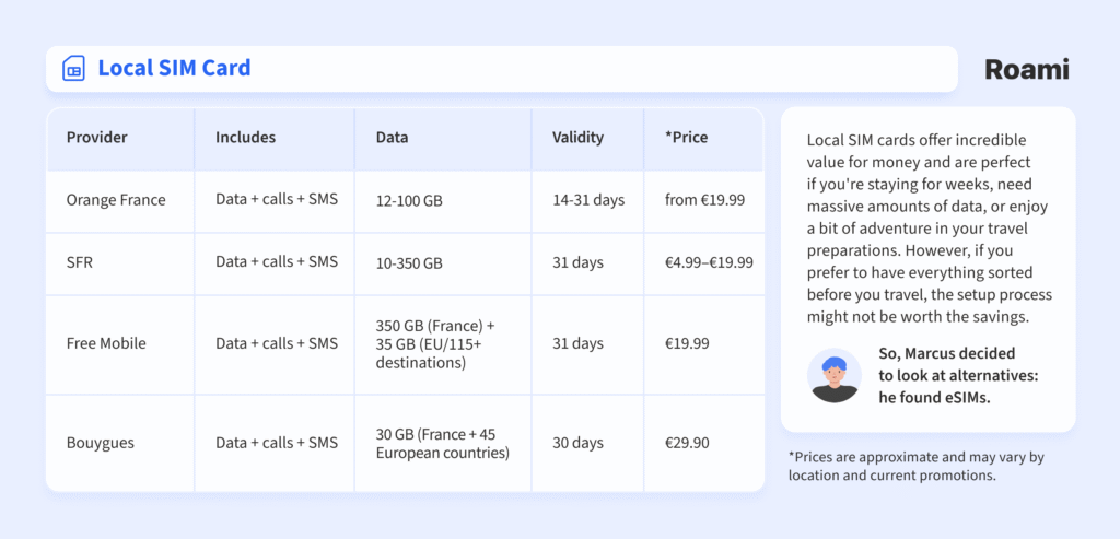 | Local SIM | €5–30 → 10–350 GB (30 days) | Medium (must buy in France) | Yes (varies by provider) | Passport registration + SIM swap | Long stays, heavy data use, budget travelers |