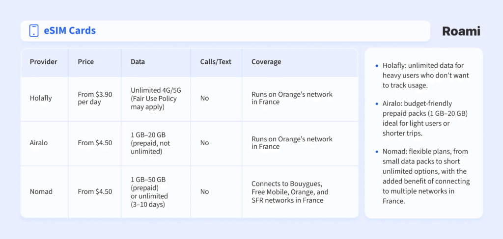 If you’re a light or budget-conscious traveler, Airalo offers low-cost, flexible packs that cover the basics. And if you want choice and reliability across multiple French networks, Nomad delivers the best of both worlds.