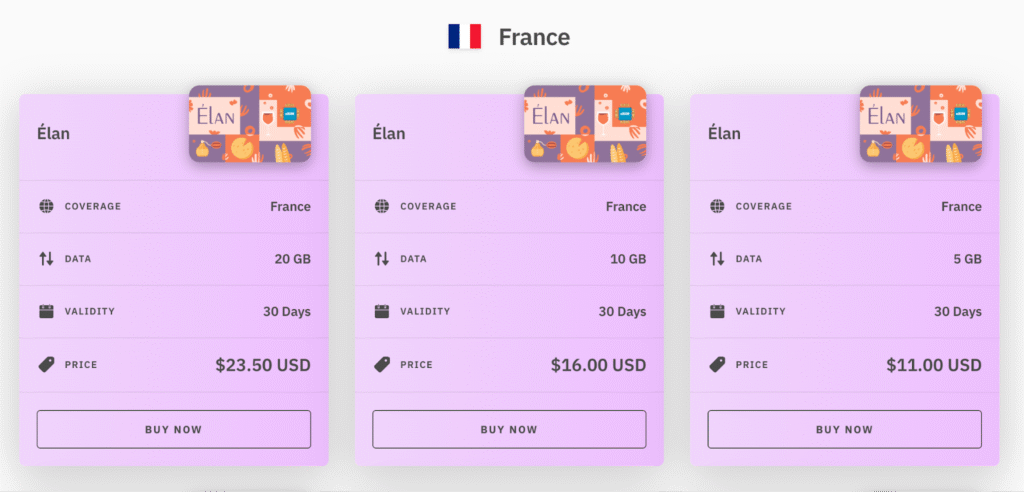 The Élan plan for France runs on Orange’s network and starts at just $4.50 for 1 GB (7 days). Larger packs include 3 GB for $7 (30 days), 10 GB for $16 (30 days), or 20 GB for $23.50 (30 days).