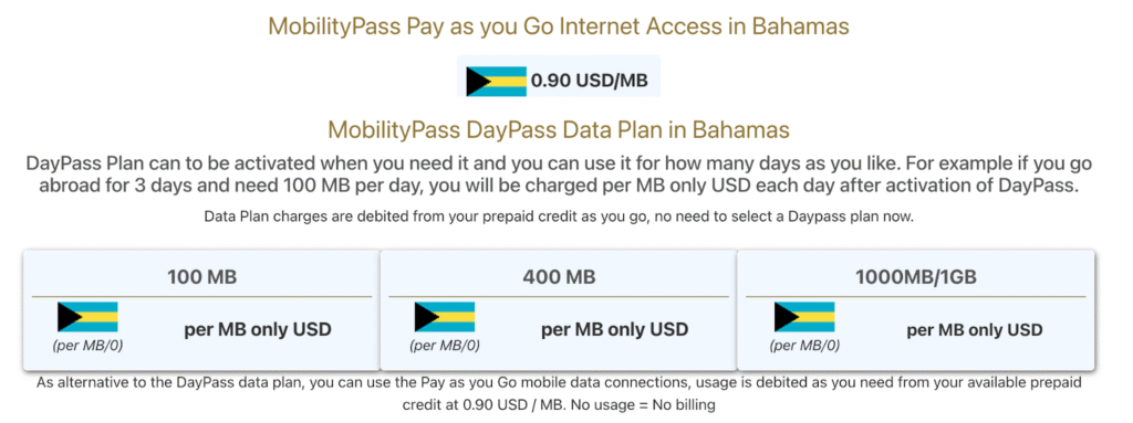 However, the downsides are significant. The per-MB rate in the Bahamas is very expensive at $0.90/MB if you don’t activate a bundle. Even DayPass bundles (100MB, 400MB, 1GB) can become costly for anyone using more than light browsing.