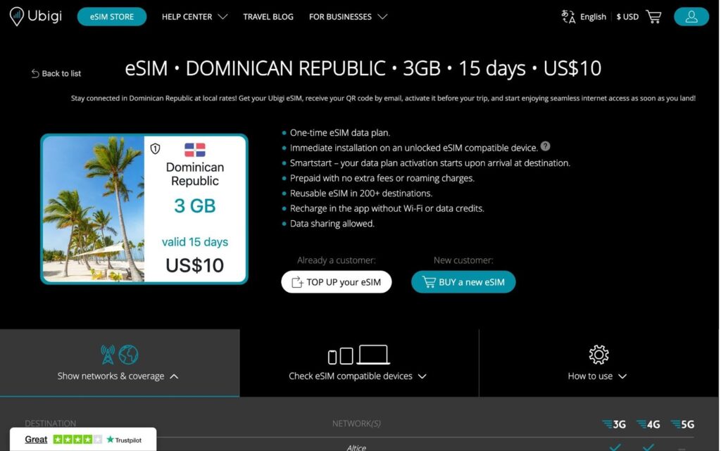 Ubigi offers a one-week unlimited plan, making it a convenient choice for vacations or business trips to the Dominican Republic. It also provides pay-as-you-go data plans in 1 GB, 3 GB, 10 GB, and 25 GB options for more flexible usage. The eSIM is activated directly through the Ubigi app, which also lets you monitor usage and manage top ups, making it appealing for both light and heavy data users.
