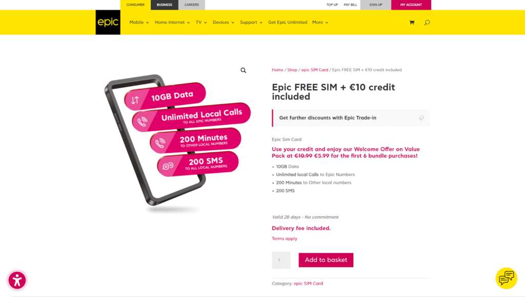 You can get an Epic SIM when you avail of an Epic Free SIM with €10 credit included for only €10. This includes 10 GB of data, unlimited local calls to Epic numbers, 200 minutes to other local numbers, and 200 SMS. After getting your Epic Malta SIM card, you can get the following top-up packs: