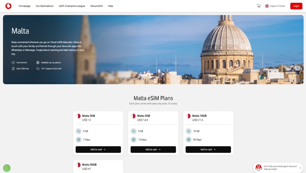 Some Malta eSIM plans offered by Vodafone Travel include: